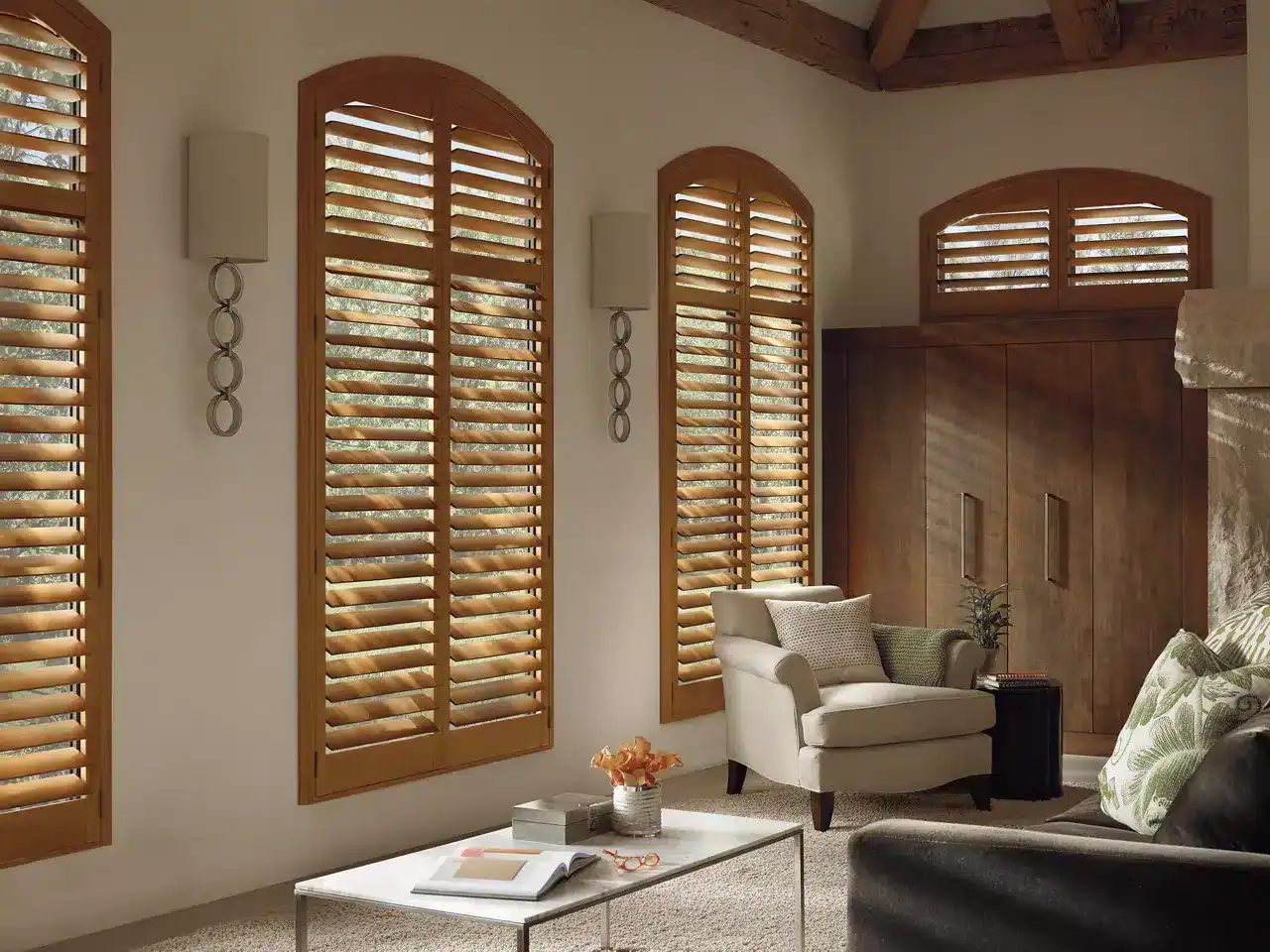 Shutters provide a classic and sturdy window solution featuring solid panels with adjustable louvers for superior light management and thermal insulation. These treatments are installed directly into the frame to create a permanent architectural feature that complements any interior design style. We offer a high-end selection of Hunter Douglas shutters in genuine hardwood, durable composite, and specialized moisture-resistant materials. Perfectly suited for humid spaces like bathrooms and kitchens, they combine lasting resilience with simple maintenance and a refined aesthetic.